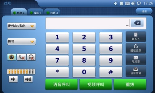 7寸大屏搭配寬大的數(shù)字虛擬鍵盤(pán),讓你的撥號(hào)準(zhǔn)確無(wú)誤。同時(shí)界面的所顯示的通話(huà)功能諸如查找聯(lián)系人、查找通話(huà)記錄、發(fā)送短消息或者快速進(jìn)入語(yǔ)音信箱等功能也清晰明了?梢园l(fā)現(xiàn)的是,用戶(hù)在輸完號(hào)碼之后可自主選擇采用語(yǔ)音呼叫還是視頻呼叫。另外,同潮流網(wǎng)絡(luò)之前的一款視頻電話(huà)GXV3140一樣的是,GXV3175也在出廠(chǎng)自帶了一個(gè)IPVideoTalk賬號(hào)。該賬號(hào)是出廠(chǎng)時(shí)就已配置好的,每一臺(tái)電話(huà)配備一個(gè)號(hào)碼并顯示在桌面上。也就是說(shuō),用戶(hù)在拿到GXV3175并聯(lián)網(wǎng)之后即可使用該賬號(hào)撥打免費(fèi)的視頻電話(huà)了。這可是很多廠(chǎng)商所沒(méi)有的特殊功能。下面我們就使用隨機(jī)附送的IPVideoTalk賬號(hào)來(lái)?yè)艽蛞曨l電話(huà)。