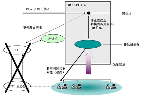- 當(dāng)RM出現(xiàn)故障(包括Server物理損壞、RM程序意外終止、網(wǎng)絡(luò)連接失效)時(shí),RM將對電話的控制權(quán)交還給PBX,PBX根據(jù)自己的電話分配規(guī)則將電話分配到坐席。