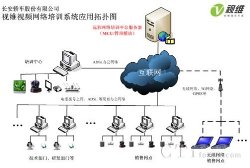 長安轎車大規(guī)模網(wǎng)絡遠程會議和培訓系統(tǒng)由服務器端和客戶端組成,服務器端軟件部署在重慶中心機房,中心機房配置1臺單獨服務器,支持400個客戶端同時在線,負責所有會議和培訓的召集、音視頻交互、加密等工作,長安轎車各部門、轄下各零售點通過WEB方式(包括ADSL、3G無線等多種網(wǎng)絡)即可實現(xiàn)客戶端軟件的自動安裝與升級,配備簡單的攝像頭和話筒之后就可以實現(xiàn)長安轎車以及400多零售點的大規(guī)模工作會議和高清音視頻網(wǎng)絡培訓。網(wǎng)絡拓撲圖如下: