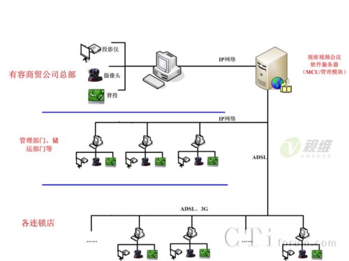 有容商貿(mào)大規(guī)模網(wǎng)絡(luò)遠程會議和培訓系統(tǒng)由服務(wù)器端和客戶端組成,服務(wù)器端軟件部署在公司中心機房,中心機房配置1臺單獨服務(wù)器,支持400個客戶端同時在線,負責所有會議和培訓的召集、音視頻交互、加密等工作,有容商貿(mào)各部門、轄下各連鎖店通過WEB方式(包括ADSL、3G無線等多種網(wǎng)絡(luò))即可實現(xiàn)客戶端軟件的自動安裝與升級,配備簡單的攝像頭和話筒之后就可以實現(xiàn)有容商貿(mào)以及連鎖店的大規(guī)模工作會議和高清音視頻網(wǎng)絡(luò)培訓。網(wǎng)絡(luò)拓撲圖如下: