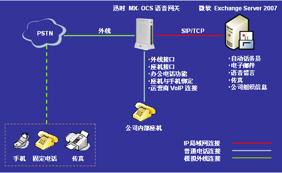 迅時通信針對微軟統(tǒng)一溝通解決方案,在2008年推出了MX-OCS系列辦公型VoIP語音網(wǎng)關(guān)。將微軟Exchange Server 2007 統(tǒng)一消息服務(wù)器與迅時通信MX-OCS網(wǎng)關(guān)集成而構(gòu)成的解決方案(簡稱“1+1”方案),能大幅降低中小企業(yè)擁有統(tǒng)一溝通平臺的成本。