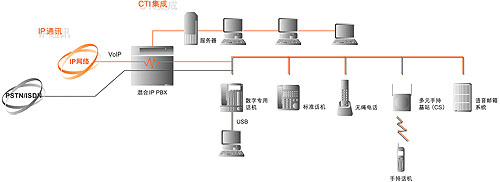 混合 IP PBX(用戶級交換機)可以作為強大的高附加值的中心CTI 系統(tǒng)的核心設備。