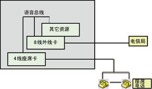 在傳統(tǒng)的語音卡設(shè)計(jì)中,一些語音卡廠商采用一體化設(shè)計(jì),根據(jù)功能的要求,采用通用的分離元件和集成電路自行設(shè)計(jì)電路。采用該類設(shè)計(jì)的語音卡板卡的通道類型、功能、通道數(shù)量在設(shè)計(jì)之初已決定,因而靈活性較差,在構(gòu)成CTI系統(tǒng)時(shí)會(huì)造成通道資源的浪費(fèi)。圖1展示了用此類板卡如何構(gòu)筑一個(gè)8外線+3座席的CTI系統(tǒng),當(dāng)用戶需要增加一個(gè)外線通道時(shí),就需另增加一塊外線卡,投資較大。