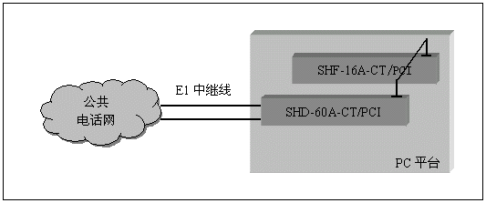 通道數(shù)較多的大中型應(yīng)用系統(tǒng),一般采用數(shù)字中繼線(E1)接入公共電話網(wǎng),三匯公司的SHD系列數(shù)字中繼卡可以提供相應(yīng)的解決方案。SHD系列數(shù)字中繼在一塊卡上集成了E1線接口,語音資源,信令處理等所必須的全部功能,其接入信令處理模塊可處理中國1號信令(SS1),7號信令(SS7),ISDN PRI協(xié)議(DSS1),單塊卡最多可支持4個E1接入。通過CT-BUS(或ST-BUS)總線,還可以在數(shù)字中繼線上實現(xiàn)傳真功能。典型應(yīng)用結(jié)構(gòu)如下圖: