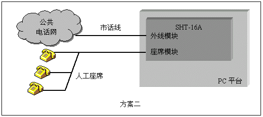 人工座席是呼叫中心(Call Center)一類應(yīng)用的主要組成部分。三匯語音卡對人工座席提供了兩套解決方案:使用SHU系列座席卡,通過交換總線與其它卡互聯(lián),為整個系統(tǒng)提供座席資源。使用SHT系列模塊化語音卡,在部分通道使用座席模塊,可用單塊卡實現(xiàn)座席和外線系統(tǒng)。第二種方式特別適用于小型呼叫中心,總機話務(wù)員等應(yīng)用。三匯公司的座席通道可以直接連接各類普通電話機,利用座席卡配置相應(yīng)的軟件,還可以構(gòu)成板卡交換機,完全取代企業(yè)用戶交換機。這類應(yīng)用的典型結(jié)構(gòu)如下圖: