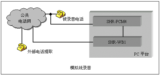 三匯公司的SHR系列監(jiān)控錄音卡可以實現(xiàn)對電話線路或其它信號源如話筒信號、對講機等進(jìn)行錄音。模擬線錄音采用高阻抗并線的方式,對被錄音對象無影響?梢詸z測電話線上直流電壓、DTMF號碼、FSK/DTMF CallerId等信號。采用配套的高阻復(fù)接盒,SHD系列數(shù)字中繼卡還能完成對數(shù)字中繼線的監(jiān)控錄音,并能分析線路上的信令,從而取得通話狀態(tài)和主被叫號碼。這兩種錄音系統(tǒng)的結(jié)構(gòu)如下圖: