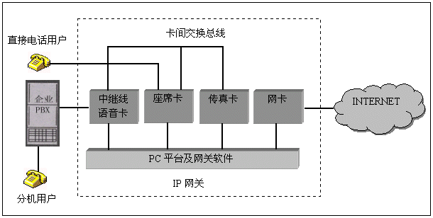 電話語音卡在IP網(wǎng)關(guān)中的典型應(yīng)用結(jié)構(gòu)如下: