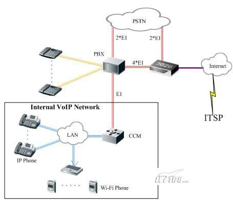 酒店申請(qǐng)了4條到CNC的E1線路,用于語(yǔ)音呼叫業(yè)務(wù),同時(shí)內(nèi)部還建設(shè)有覆蓋整個(gè)酒店的VoIP網(wǎng)絡(luò),通過(guò)CCM系統(tǒng)進(jìn)行集中管理,CCM系統(tǒng)與PBX之間通過(guò)E1線進(jìn)行連接。