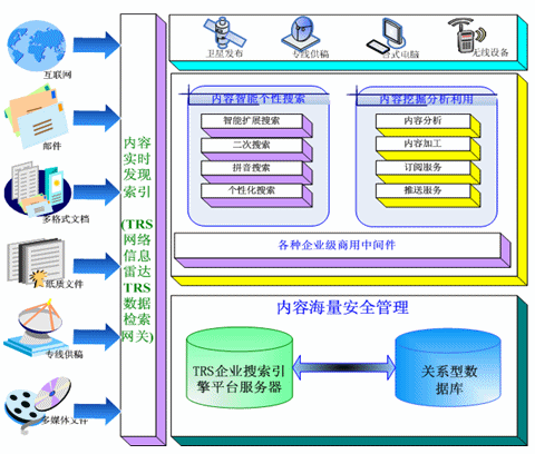 TRS公司推出的企業(yè)搜索引擎解決方案,利用TRS公司多年來自主開發(fā)的TRS Database Server作為企業(yè)搜索引擎服務(wù)的平臺(tái)。可以將電信企業(yè)內(nèi)外部多種格式、多種介質(zhì)形態(tài)、多種存儲(chǔ)方式的內(nèi)容信息,以實(shí)時(shí)的方式將這些信息進(jìn)行索引。并且在索引的過程中力求能夠做到準(zhǔn)確,并配合以相關(guān)智能語言技術(shù)做信息的去重、自動(dòng)標(biāo)引等能力。其框架如圖: