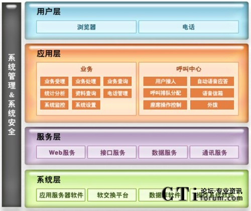 用戶層是服務(wù)熱線系統(tǒng)與系統(tǒng)使用者之間的聯(lián)系層。工作人員可以通過瀏覽器進(jìn)入系統(tǒng)的業(yè)務(wù)部分進(jìn)行工作,處理相應(yīng)事務(wù);用戶可以通過電話打入系統(tǒng)的呼叫中心部分,獲得自動(dòng)或人工服務(wù);同時(shí),系統(tǒng)可以進(jìn)行電話外撥,聯(lián)系相關(guān)部門或?qū)τ脩暨M(jìn)行主動(dòng)服務(wù)。