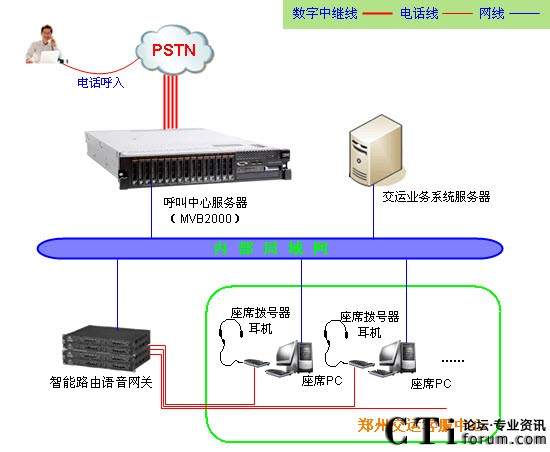 鄭州交運服務(wù)熱線采用暢信達通信MVB2000系統(tǒng)作為交換平臺,采用企業(yè)級智能路由語音網(wǎng)關(guān)結(jié)合話機作為座席終端,系統(tǒng)共接入數(shù)字中繼線4條(4E1),座席分機90臺,系統(tǒng)通過內(nèi)部局域網(wǎng)組網(wǎng),系統(tǒng)架構(gòu)形式如下: