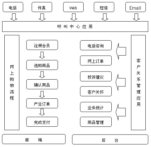 依照我公司的建設(shè)方向,中小型網(wǎng)上購物平臺(tái)的客戶服務(wù)呼叫中心系統(tǒng)應(yīng)具備呼叫中心的基本功能,同時(shí)融入了網(wǎng)上購物的客戶關(guān)系管理(CRM)流程,因此,它是呼叫中心與CRM系統(tǒng)的有機(jī)結(jié)合體,包含電話咨詢、網(wǎng)上訂單、客戶關(guān)懷等主要功能層的應(yīng)用。