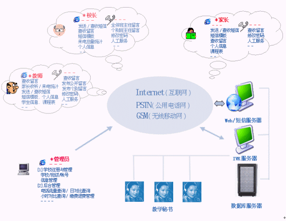 | 統(tǒng)計(jì)…. | 通過(guò)INTERNET了解本校的學(xué)生、教師等進(jìn)入家校通的來(lái)電次數(shù),留言數(shù)量等信息,為校長(zhǎng)進(jìn)行的教學(xué)安排提供詳實(shí)的參考 |