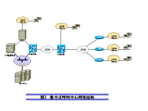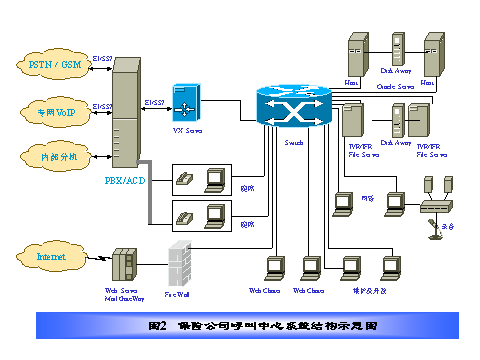 某保險(xiǎn)公司電話中心采取全國集中服務(wù)方式,其結(jié)構(gòu)如圖2所示,在電話呼叫中心集中管理所有人工語音坐席和電話中心運(yùn)行所需的所有業(yè)務(wù)數(shù)據(jù)、語音文件和硬件設(shè)備,服務(wù)全國。我們設(shè)計(jì)的方案具有如下特點(diǎn):
