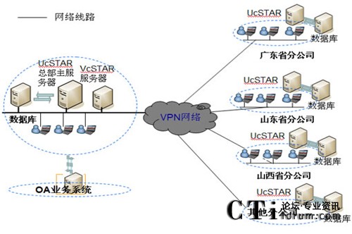 在公司總部部署主UcSTAR服務(wù)器,全國(guó)省級(jí)分公司分別部署一套子UcSTAR服務(wù)器,組成星型結(jié)構(gòu)公司內(nèi)部的溝通與協(xié)作系統(tǒng)。