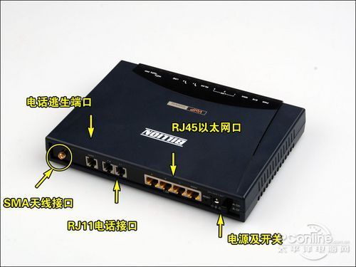 BiPAC 6404VGP后面接口板除了和普通無線路由器一樣有1個WAN接口,4個LAN接口外,還多出了三個RJ11的電話接口,這個就是用來連接傳真機或電話機的。此外,考慮到BiPAC 6404VGP的無線功能在企業(yè)中應用需要有較大的信號覆蓋范圍,所以它還提供了一個SMA天線接口可用來連接高增益天線。