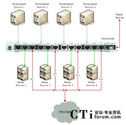 正常通信時,BRI\PRI線路信號流向主服務(wù)器,進(jìn)行正常語音通信(BRI\PRI-OUT2),當(dāng)主服務(wù)器發(fā)生意外斷電,不能正常使用時,BRI\PRI線路信號流向備份服務(wù)器(BRI\PRI-OUT1),保證正常通信。具體連接示意如下圖所示: