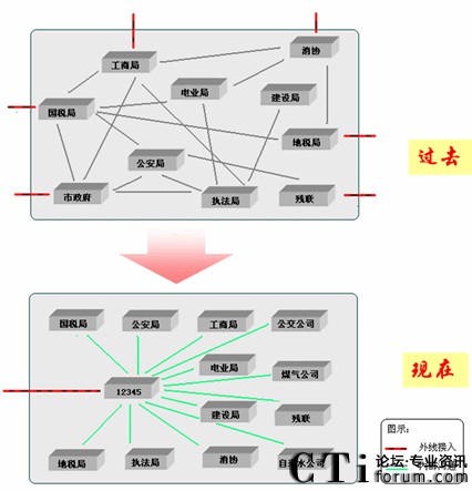 “12345” 政府熱線系統(tǒng)建設的最終目標,將要整合現(xiàn)有的全部政府部門公開電話資源,將所有的此類電話統(tǒng)一為一個號,使政府公開電話服務范圍覆蓋到政府公共服務的全部領域。通過12345電話網(wǎng)絡將各級機構(gòu)服務電話資源進行互聯(lián)(市區(qū)縣政府、公安非應急電話、社保局、民政局、建設局、規(guī)劃局、國稅局、地稅局、教育局、衛(wèi)生局、文體局、旅游局、交通局、房產(chǎn)局等),這樣市民就不用再被這些部門上百個不同的電話號碼弄得無所適從,也不會因為弄不清楚事情歸哪個部門管了。
