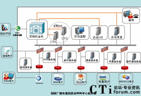 系統(tǒng)主要包含IVR服務(wù)器,CTI服務(wù)器,短信網(wǎng)關(guān),郵件服務(wù)器,傳真服務(wù)器,數(shù)據(jù)庫服務(wù)器,座席系統(tǒng)等?蛻魮艽蛱胤(hào)碼接入廣電公司客服系統(tǒng),首先由IVR提供自動(dòng)語音服務(wù)。CTI服務(wù)器負(fù)責(zé)所有的電話的路由、排隊(duì)、轉(zhuǎn)接和控制?蛻粼诮邮茏詣(dòng)語音服務(wù)時(shí),如果需要人工幫助,可選擇轉(zhuǎn)入人工座席。由IVR系統(tǒng)向CTI發(fā)出轉(zhuǎn)接請(qǐng)求,完成轉(zhuǎn)接功能。