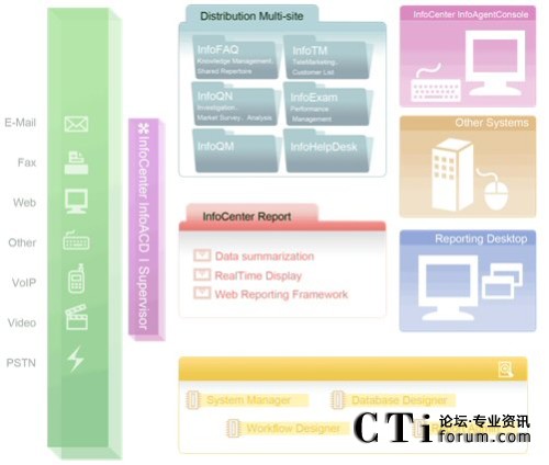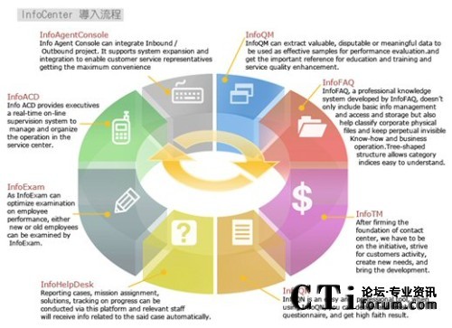 由于今日的客服中心已是多媒體的客服中心,不再只有單純的電話進線,客戶尋求服務的管道更多樣化,InfoCenter Total Solution可以完全整合應用程序、數(shù)據(jù)倉儲系統(tǒng)、多媒體溝通互動管道,藉由不同的系統(tǒng)達到分析與處理客戶需求,并且達到一致性的工作流程管理,提供更高質(zhì)量的服務。