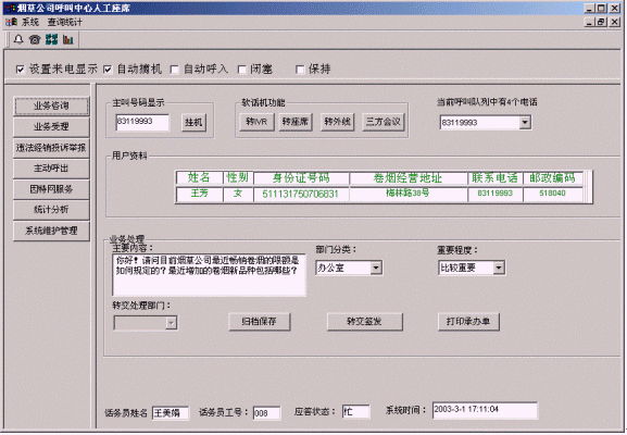 客戶打入電話后,當系統(tǒng)的自動語音應(yīng)答子系統(tǒng)無法解決客戶問題時,客戶可選擇人工服務(wù),由企業(yè)客戶服務(wù)代表直接接聽客戶電話,處理并解決客戶問題。此時客戶同座席話務(wù)人員直接溝通,并同時記錄下該客戶的聯(lián)系方式,將相關(guān)數(shù)據(jù)添加入系統(tǒng)數(shù)據(jù)庫;也可以在數(shù)據(jù)庫的支持下回答接受查詢卷煙/價格/限額/新品種、卷煙經(jīng)營規(guī)范制度/卷煙專賣政策法規(guī)咨詢、通報最近暢銷卷煙的限額情況/通報最近增加的新品種/煙草公司召集的活動通知、投訴和舉報違法經(jīng)銷行為、卷煙預(yù)訂、電話訪銷、滿意度調(diào)查等。