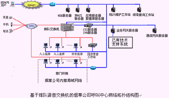 該系統(tǒng)的設(shè)計采用先進的三層CLIENT/SERVER網(wǎng)絡(luò)體系結(jié)構(gòu),集目前先進的計算機技術(shù)、通信技術(shù)、計算機電信集成(CTI)技術(shù)、多媒體呼叫接入技術(shù)、智能接入交換分配技術(shù)、數(shù)字語音處理技術(shù)、異構(gòu)系統(tǒng)信息交互技術(shù)、INTERNET網(wǎng)絡(luò)技術(shù)、安全容錯技術(shù)、網(wǎng)絡(luò)組網(wǎng)技術(shù)等于一體,并與煙草公司已有技術(shù)支持系統(tǒng)(如MIS系統(tǒng)、辦公自動化系統(tǒng)等)緊密結(jié)合在一起,突破時空的限制,通過人工座席、自動語音/傳真、煙草公司相關(guān)工作人員等為客戶提供電話、傳真、電子郵件、因特網(wǎng)、手機、短消息等多種服務(wù)形式的周到、快捷、全方位的服務(wù),為卷煙經(jīng)銷戶等客戶與煙草公司之間架起一座密切聯(lián)系的橋梁,使得客戶隨時隨地可以利用身邊的各種通訊工具獲得煙草公司的方便快捷的24小時全天候服務(wù)。