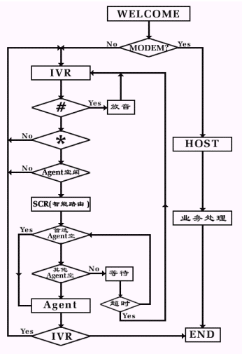 呼入一般都先通過ACD進行排隊,然后根據用戶選擇進入子系統(tǒng),流程圖如下:
