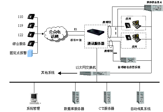 綜合接警平臺主要由hxd09可編程智能語音交換機和計算機網(wǎng)絡兩部分組成,交換機負責110、119、122報警電話的接入與分流及調度呼出等功能;計算機網(wǎng)絡則完成110、119、122報警信息的顯示、數(shù)據(jù)儲存、統(tǒng)計及信息查詢、發(fā)布功能。