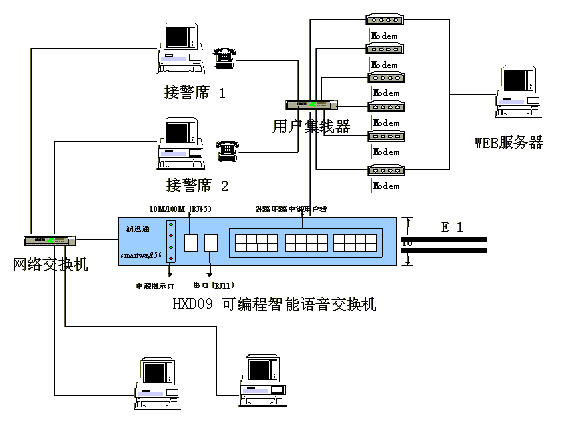 - 系統(tǒng)采用呼叫中心模式,交換平臺采用hxd09可編程智能語音交換機而非傳統(tǒng)的語音交換機,基于Windows2000 server平臺,客戶端采用瀏覽器方式。