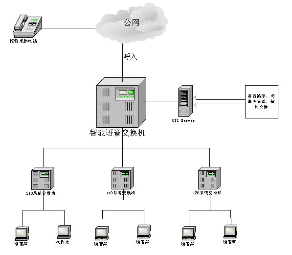 公安綜合信息呼叫中心系統(tǒng)就是在呼叫中心基礎上利用先進的CTI技術,將現(xiàn)存和即將開通的信息系統(tǒng)有機地整合起來;即把數(shù)字語音技術、計算機網(wǎng)絡技術、通信、交換等先進技術結合起來,結合公安業(yè)務特點,擴展和增強公安信息應用系統(tǒng)的功能,使現(xiàn)有數(shù)據(jù)庫資源得到充分利用;還可使一部分可以公開或應該公開的公安信息向社會提供增值服務,如出入境辦理查詢、身份證查詢、車輛駕駛員信息查詢等。本系統(tǒng)以110、119、122綜合報警服務為龍頭,以各項公安工作信息化為主要內容,以公安計算機信息、通信網(wǎng)絡為依托,以對內提供信息多種方式綜合利用、對外提供社會服務為目的,以當前先進的INTENNET、CTI、數(shù)據(jù)庫技術為手段,建立起的對內統(tǒng)一受理、指揮調度、快速反應、協(xié)同作戰(zhàn);對外警務公開、信息咨詢、查詢、投訴舉報為一體的公安綜合信息呼叫中心系統(tǒng)。