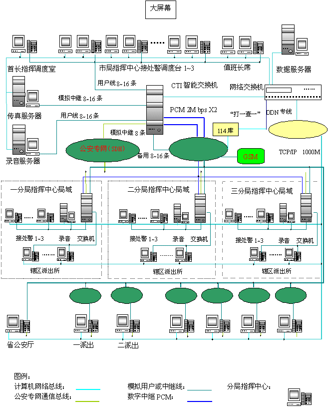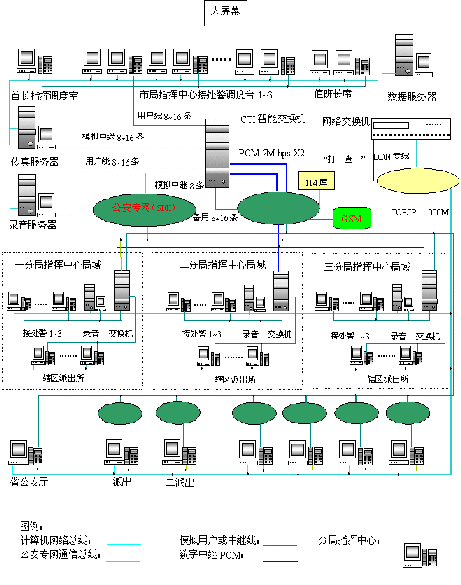 - 樹立大網(wǎng)絡概念:采用先進的通訊、計算機網(wǎng)絡技術(采用CTI可編程交換技術),利用現(xiàn)有的通信資源,實現(xiàn)市局指揮中心與消防大隊、交警大隊、各派出所的計算機網(wǎng)絡及相關領導辦公室計算機大聯(lián)網(wǎng);形成全市范圍內110、119、122有線、無線全方位立體調度語音通道大網(wǎng)。