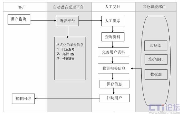 用戶選擇電話訂購(gòu)后,轉(zhuǎn)接到電話訂購(gòu)服務(wù)組,由坐席人員根據(jù)用戶說明的藥品名稱查詢,告知用戶價(jià)格,記錄用戶信息,詢問是否需要送貨,是否需要發(fā)票等信息。