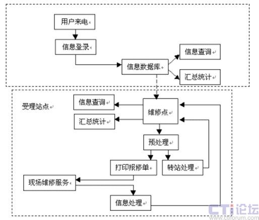 維修點(diǎn)對用戶的報修情況進(jìn)行預(yù)處理之后,根據(jù)用戶所在的區(qū)域,分配至最近距離的維修站,將用戶與其報修信息即時轉(zhuǎn)移,這也就是圖中所顯示的"轉(zhuǎn)站處理"。之后,維修站將直接打印出報修單,加快服務(wù)實(shí)施的效率、減少人工出錯的比例,有專業(yè)人員及時上門服務(wù)檢修。
