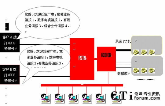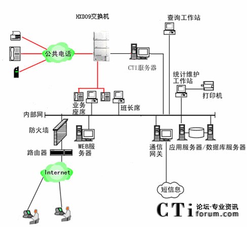 本系統(tǒng)物理結(jié)構(gòu)HXD交換機(jī)、CTI服務(wù)器、IVR(交互式語音應(yīng)答)/IFR(交互式傳真應(yīng)答)服務(wù)器、業(yè)務(wù)代表座席(邏輯上分為:普通業(yè)務(wù)代表座席、專家座席等)、班長(zhǎng)座席、統(tǒng)計(jì)維護(hù)管理工作站、因特網(wǎng)(WEB)服務(wù)器、數(shù)據(jù)庫/應(yīng)用服務(wù)器、錄音工作站、網(wǎng)絡(luò)系統(tǒng)等構(gòu)成。