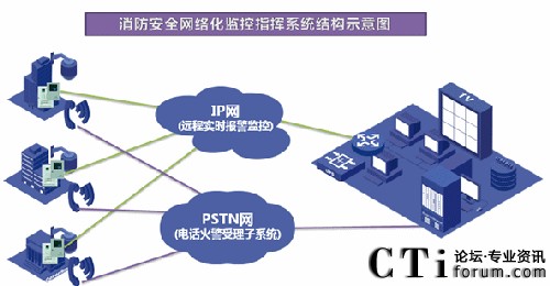 消防網(wǎng)絡(luò)傳輸設(shè)備通過以太網(wǎng)(TCP),電話線(PSTN),無線(GPRS、CDMA)將火災報警主機接收到的火警及運行信息上傳的鋼廠消防安全監(jiān)控指揮中心。