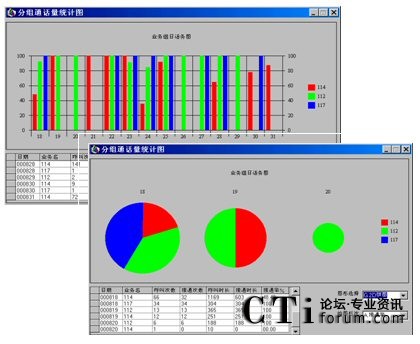 從類別上看,多種業(yè)務(wù),不論種類如何,都可以劃為一類;多個(gè)座席可以劃為另一類。因此,同類合在一起,以同樣的圖形表示,就可以作出直觀比較。如二個(gè)從事同一業(yè)務(wù)的座席的接通率比較就非常有意義
