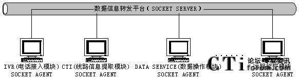 SERVER)上,程序登錄后會(huì)自動(dòng)得到SOCKET SERVER分配的一個(gè)節(jié)點(diǎn)號。從此,系統(tǒng)中的各個(gè)模塊就可以通過數(shù)據(jù)信息轉(zhuǎn)發(fā)平臺方便的進(jìn)行信息交互。