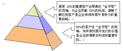 。。從抽象和通用的意義上講,多數(shù)企業(yè)的客戶價(jià)值分布是適合"二八法則"的,即20%的客戶創(chuàng)造了80%的利潤(rùn)。但對(duì)每個(gè)企業(yè)而言,要洞察"究竟哪些客戶才是最有價(jià)值的客戶?""這些客戶在哪些方面的價(jià)值最大?""他們有什么共同的特征?"卻不是一件很容易的事。目前,多數(shù)企業(yè)的管理方式還停留在根據(jù)某一項(xiàng)或兩項(xiàng)單一指標(biāo)(如銷售額或利潤(rùn))來(lái)作的客戶排行,無(wú)法進(jìn)行多方位的綜合的客戶價(jià)值分析、管理。而要實(shí)現(xiàn)"以客戶為中心"的CRM理念,就必須建立一套全面的客戶價(jià)值評(píng)估管理系統(tǒng),并利用系統(tǒng)強(qiáng)大的數(shù)據(jù)分析、挖掘功能,快速地進(jìn)行客戶群價(jià)值細(xì)分管理,建立起客戶價(jià)值金字塔。