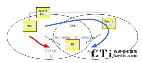 在GRRU安裝過程中會遇到信源基站和光纖直放站信號重疊的問題,就是由于多徑傳播引起的時(shí)間色散產(chǎn)生同頻干擾。對于上圖所示,我們假設(shè)基站到戶用之間的信號質(zhì)量較好,能夠接收到正常的基站信號,但是此時(shí)如果引入一個(gè)GRRU,此時(shí)的時(shí)延差為delayB-delayA=(5Km的空間時(shí)延+10Km光纜時(shí)延+設(shè)備時(shí)延)-5Km的空間時(shí)延=10Km光纜時(shí)延+設(shè)備時(shí)延=2Km×4.76us/Km+10μs=19.52 us>15μs(4TA)。此時(shí)直放站的信號就只能判斷為同頻干擾信號,必須小于同頻干擾保護(hù)比9dB。
