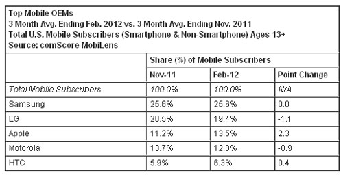 按截至今年2月份的三個月的平均數(shù)計算,美國13歲以上的手機用戶數(shù)為2.34億。三星名列手機原始設(shè)備制造商之首,占有美國手機市場25.6%的份額;LG電子名列第二,占有19.4%的市場份額;蘋果排名第三,占有13.5%的市場份額(上升2.3個百分點);摩托羅拉排名第四,占有12.8的市場份額;HTC排名上升至第五,占有6.3%的市場份額(上升0.4個百分點)。