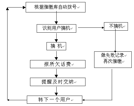 催費(fèi)工作是由指定的欠費(fèi)數(shù)據(jù)文件(或欠費(fèi)數(shù)據(jù)庫(kù))中提取用戶(hù)手機(jī)號(hào)碼和欠費(fèi)金額,自動(dòng)順序向各欠費(fèi)用戶(hù)撥號(hào),撥通后自動(dòng)播放催費(fèi)通知并通報(bào)欠費(fèi)金額數(shù)。系統(tǒng)自動(dòng)統(tǒng)計(jì)通話(huà)結(jié)果,系統(tǒng)對(duì)未應(yīng)答用戶(hù)會(huì)自動(dòng)重復(fù)多次撥叫。