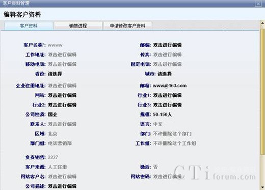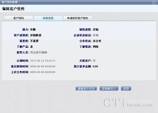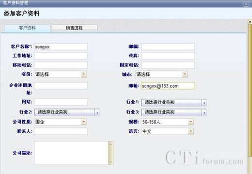 對新添加的客戶錄入客戶信息資料,包括客戶的名稱、郵箱等,為其建立起一個新的客戶關系,可以隨時找到該客戶的具體信息以及他的銷售情況,方便對客戶銷售進程有一個充分地實時跟蹤,并為之更好地服務。
