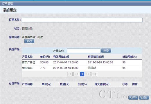 選擇訂單的名稱,供客戶選擇的產品,在供選產品列表下選擇產品名稱,然后所選的產品就會出現(xiàn)在已選產品列表下,完成后點擊【保存】,這樣一個訂單就生成了。