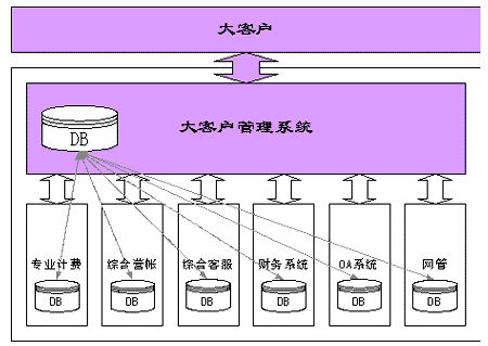 電信企業(yè)大客戶管理系統(tǒng)是電信企業(yè)信息系統(tǒng)中的一個組成部分,與其它業(yè)務(wù)系統(tǒng)如大客戶服務(wù)系統(tǒng)、綜合營帳、財務(wù)系統(tǒng)、計費系統(tǒng)、OA系統(tǒng)、網(wǎng)管系統(tǒng)等都有著不可分割的聯(lián)系,它需要從這些系統(tǒng)中提取相應(yīng)的數(shù)據(jù)并且把相應(yīng)的數(shù)據(jù)傳輸?shù)狡渌到y(tǒng),或者和這些系統(tǒng)一起完成系統(tǒng)的某些重要功能,如合同跟蹤等。而且大客戶管理系統(tǒng)也會極大影響各個業(yè)務(wù)系統(tǒng)的運行,大客戶系統(tǒng)與相關(guān)系統(tǒng)之間的關(guān)系如下圖所示: