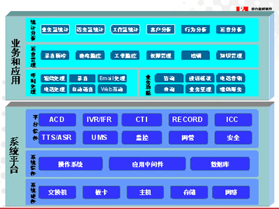從呼叫中心的建設(shè)角度分析,系統(tǒng)將分為系統(tǒng)平臺(tái)和業(yè)務(wù)應(yīng)用2大部分: