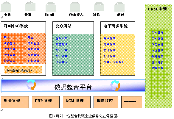 綜上所述,在物流行業(yè)目前的信息化建設(shè)基礎(chǔ)上,以呼叫中心為前端的信息聯(lián)絡(luò)渠道,以電子商務(wù)平臺(tái)作為更高級(jí)別的系統(tǒng)運(yùn)營(yíng)支撐,以CRM技術(shù)進(jìn)行客戶管理、分析決策、優(yōu)化流程的手段,整合傳統(tǒng)的物流信息系統(tǒng),將會(huì)是一個(gè)更加寬廣的市場(chǎng)!
