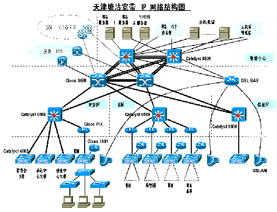 除以上三層之外,在塘沽電信局將建立一個(gè)數(shù)據(jù)中心,由兩臺(tái)Cisco Catalyst6509第三層交換機(jī)為數(shù)據(jù)中心提供數(shù)據(jù)交換及路由。接入的DSLAM設(shè)備,小區(qū)內(nèi)的樓層交換機(jī)及用戶前端設(shè)備(CPE)也屬于接入層。接入層主要為最終用戶提供多種寬帶接入方式。