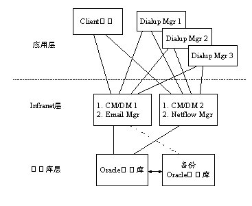 硬件平臺(tái)呈3層結(jié)構(gòu),分別為應(yīng)用層、Infranet計(jì)費(fèi)和用戶管理層以及數(shù)據(jù)庫(kù)層。