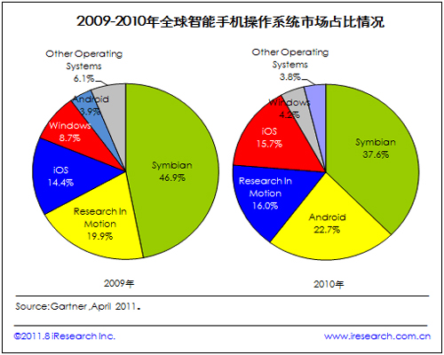 根據(jù)Gartner最新發(fā)布的數(shù)據(jù)可以看到,智能手機操作系統(tǒng)市場占比情況從2009年到2010年變化很大,Symbian仍然是占比最大的操作系統(tǒng),但是,其下降趨勢可見一斑。而Android和iOS則快速增長,2010年Android以22.7%的市場份額位列第二。經(jīng)過2011年的發(fā)展,這一市場格局還將有新的變化。