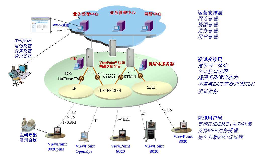 “視點通”ViewPoint®8000綜合視訊系統(tǒng)可以充分利用現(xiàn)有網(wǎng)絡資源,為網(wǎng)絡運營商提供完善的訊業(yè)務運營解決方案,使得視訊業(yè)務真正能夠廣泛服務于遠程教學、企業(yè)會商、遠程醫(yī)療、應急通信、行政會議等領域,并逐步進入千家萬戶。